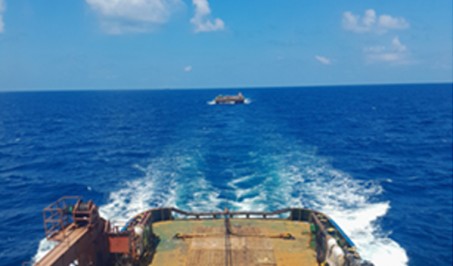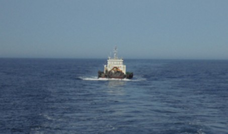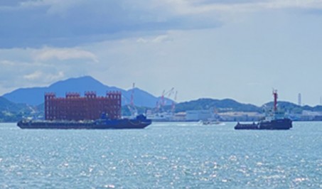 A Deck barge towed from Mokpo, KR to Kure, JP in 3 days by 3,600hp c..