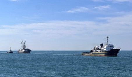 A Fishing vessel towed from Rendezvous point to Busan, KR in 14 days..